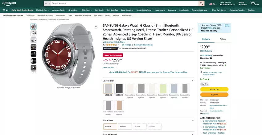 We hebben het over het Samsung Galaxy Watch 6 Classic model in zilverkleur, met Bluetooth en een kast van 43 mm. Het apparaat kost $200.99 $399.99, -50%. Dit is de beste prijs voor het apparaat in de afgelopen 30 dagen.