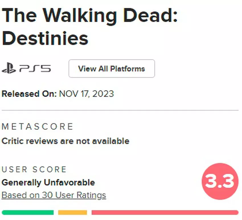 Op Metacritic heeft The Walking Dead: Destinies een beoordeling van 3,3 van gebruikers en experts hebben het spel niet serieus genomen en beoordeeld.