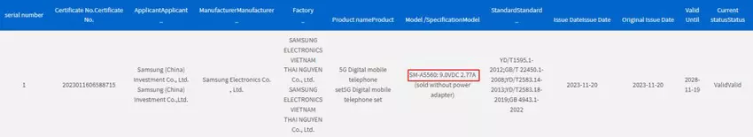 In de documenten komt de Galaxy A55 5G voorbij met het modelnummer SM-A5560. De smartphone wordt geleverd met 25W snellaadondersteuning. Overigens heeft de huidige Galaxy A54 5G smartphone precies dezelfde oplaadfunctie.