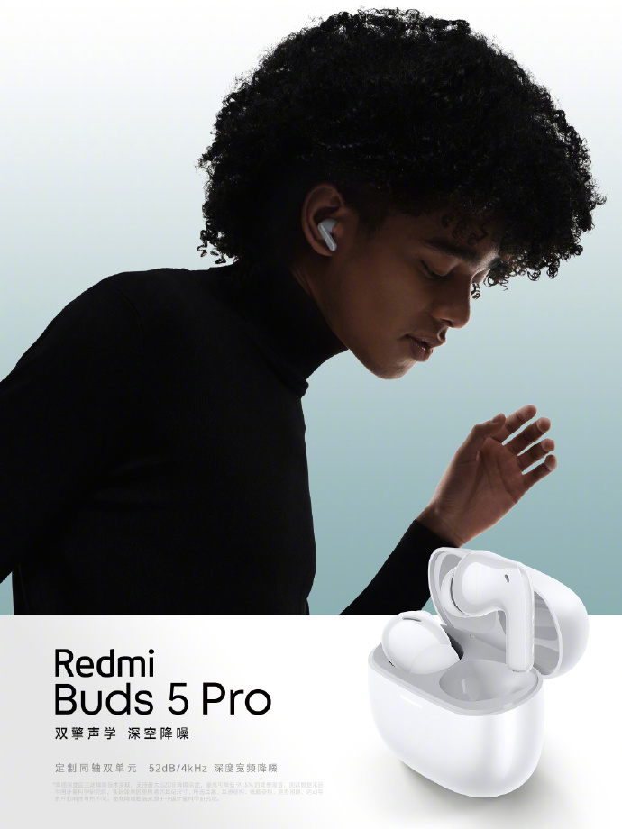 Een andere nieuwigheid van de presentatie is de draadloze koptelefoon Redmi Buds 5 Pro - een verbeterde versie van de Redmi Buds 5. Op de promotieposter zie je drie kleuren, extra microfoons (waarschijnlijk om de ruisonderdrukking te verbeteren) en een vernieuwde oplaadbehuizing.