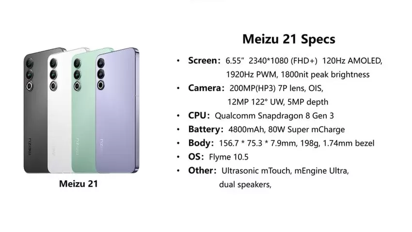 Volgens het lek krijgt de Meizu 21 een behuizing met afmetingen van 156,7×75,3×7,9 mm en een gewicht van 198 gram. De nieuwigheid wordt geleverd met een 6,55-inch Full HD+ AMOLED-scherm met 120Hz. Het paneel heeft een piekhelderheid van 1800 nits. De gadget is uitgerust met een Snapdragon 8 Gen 3-chip en een 4.800 mAh batterij. Deze zal 80W snelladen ondersteunen.