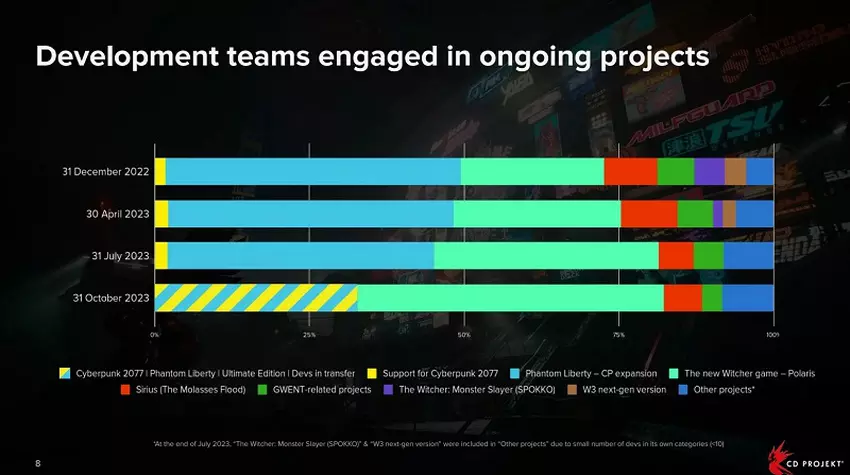 CD Projekt's CFO Piotr Nielubowicz onthulde dat het bedrijf het aantal werknemers dat werkt aan het volgende deel van de The Witcher-franchise verhoogt. Op dit moment zijn er 330 mensen betrokken bij het werk aan de game met de codenaam The Witcher: Polaris, wat meer dan de helft is van het totale aantal ontwikkelaars van CD Projekt team. Dit is meer dan de helft van het totale aantal ontwikkelaars van CD Projekt team. Bovendien wordt verwacht dat tegen het midden van 2024 hun aantal 400 mensen zal overschrijden.