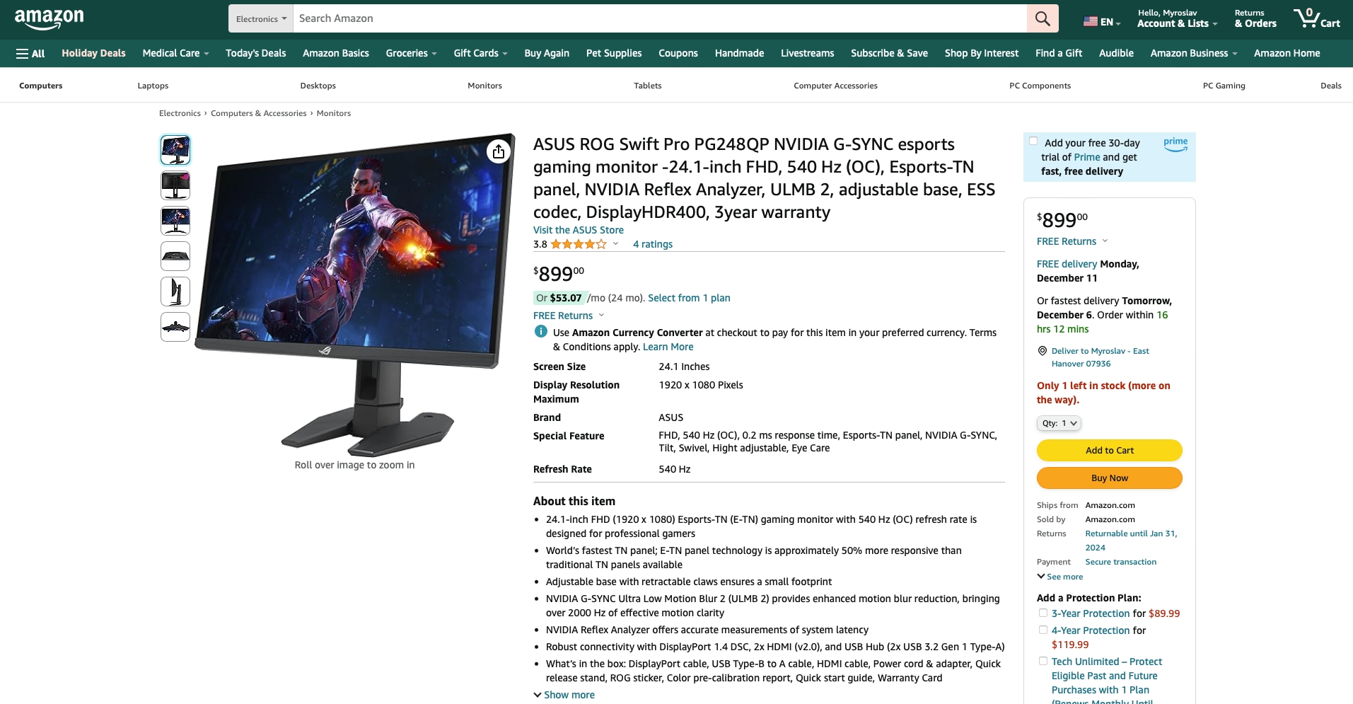 ASUS introduceerde begin 2023 de ROG Swift Pro PG248QP - 's werelds eerste monitor met een 540Hz-scherm. Nu is de fabrikant eindelijk begonnen met de verkoop van de noviteit.