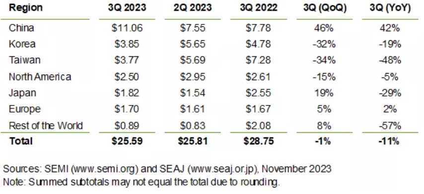 In het derde kwartaal van 2023 verminderden fabrikanten hun aankopen van chipapparatuur met 1% ten opzichte van het tweede kwartaal. In de verslagperiode daalde de markt tot $25,6 miljard, waarvan $11,06 miljard afkomstig was uit China.
