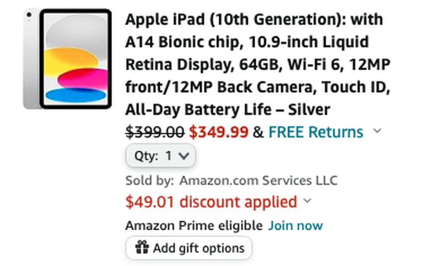 We hebben het over het 10e generatie iPad model met Wi-Fi. De gadget in de kleuren Blauw en Zilver kost check price on amazon. Maar de verkoper biedt ook een coupon met een extra korting van 49 dollar.