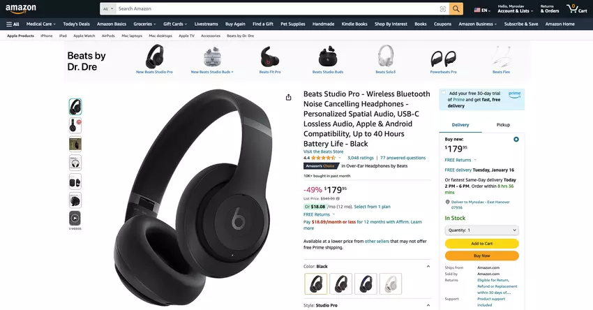 We hebben het over het Beats Studio Pro-model voor $179.95 $349.99, -49%. Je kunt kiezen uit vier kleuren: Sandstone, Navy, Diepbruin en Zwart.