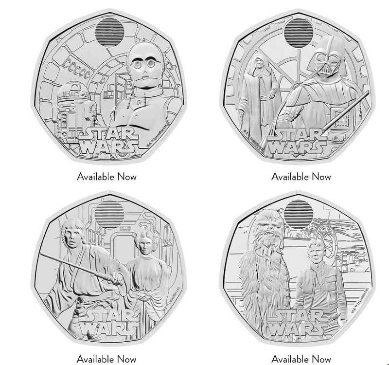 Vier exclusieve 50 pence munten zijn nu te koop. Op de voorkant staan personages uit de originele Star Wars trilogie van films afgebeeld - droids R2-D2 en C-3P0, Darth Vader en Emperor Palpatine, Luke Skywalker en Princess Leia, evenals Han Solo en Chewbacca.