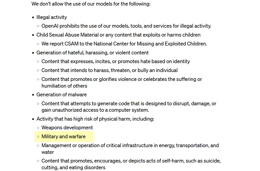 Het bedrijf OpenAI heeft onaangekondigde wijzigingen aangebracht in het beleid voor het gebruik van zijn producten. Met name een direct verbod op het gebruik van chatbots en andere ontwikkelingen voor militaire doeleinden is uit het document geschrapt.
