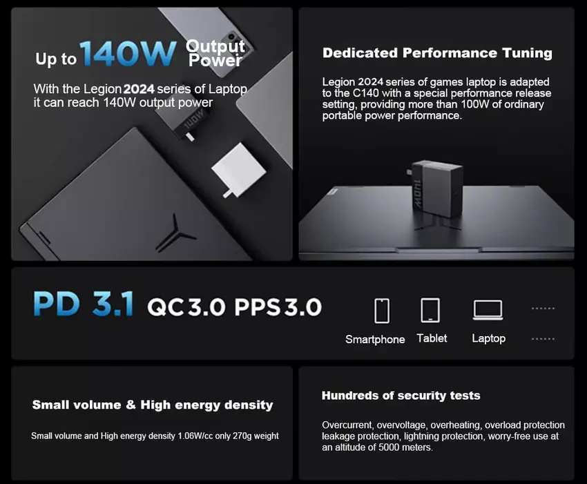 Lenovo heeft de Legion C140 2024 GaN-oplader geïntroduceerd met 140W vermogen en een prijs van $30