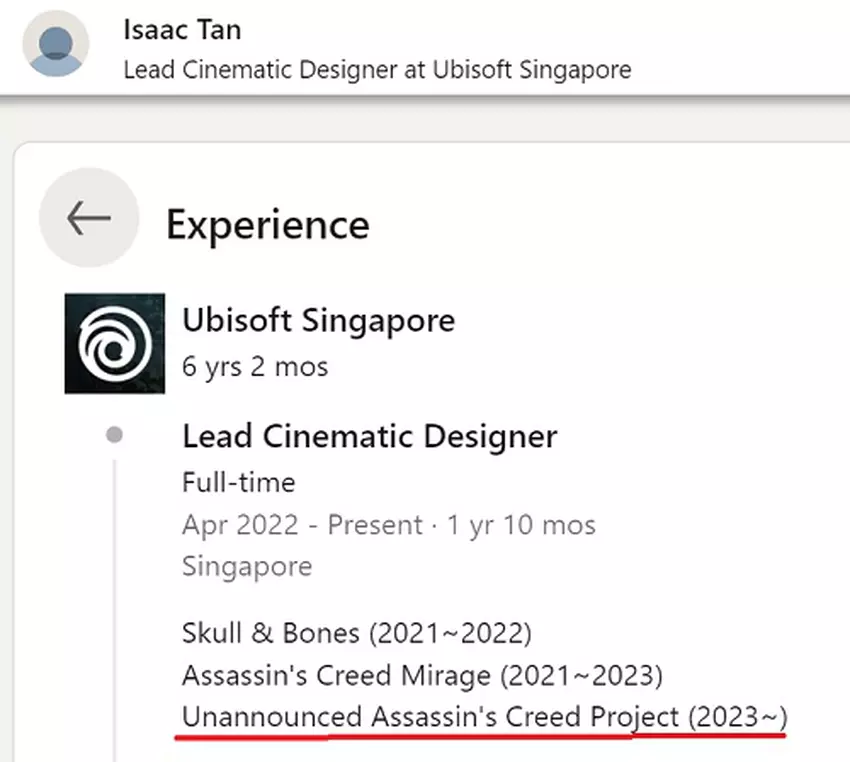 Isaac Tan, lead cinematic designer bij Ubisoft Singapore, gaf op zijn LinkedIn-pagina aan dat hij al sinds 2023 bezig is met de ontwikkeling van een onaangekondigd project gebaseerd op het Assassin's Creed-universum.