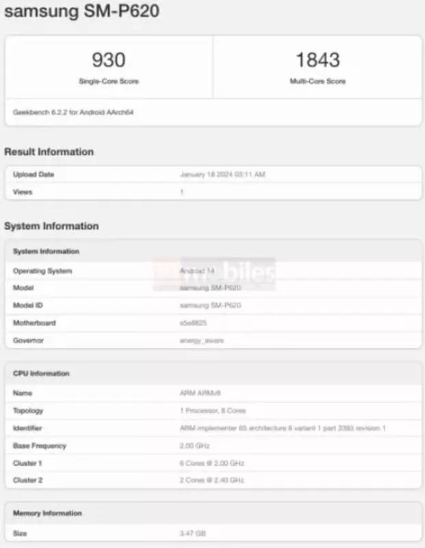 Informatie werd gedeeld door de publicatie 91mobiles. Het gaat om een nieuwe budgettablet. Het apparaat is al getest in Geekbench. De nieuwigheid komt voorbij met modelnummer SM-P620, Android 14 en Exynos 1280-processor. Dit is een vijf-nanometer SoC c acht kernen: twee krachtige Cortex-A78 en zes energiezuinige Cortex-A55. De chip wordt geleverd met een 5G-modem en Mali-G68 graphics.