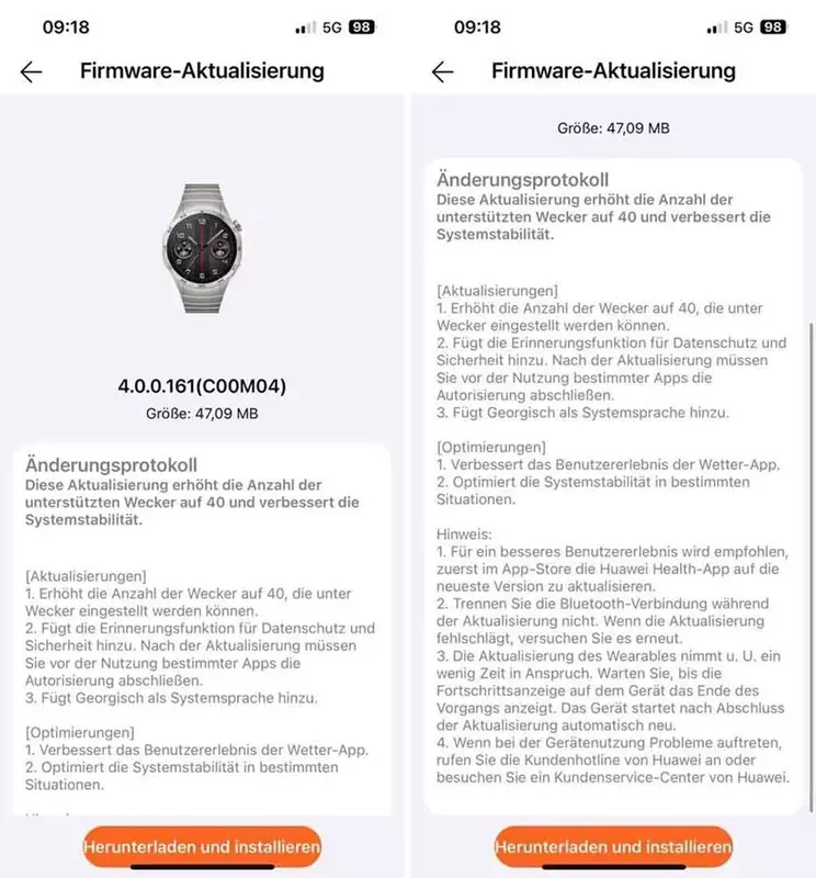 Met de systeemupdate heeft de Huawei Watch GT 4 een nieuwe beveiligingsfunctie gekregen die de gebruiker automatisch waarschuwt om gegevens te verifiëren nadat de update is voltooid. Huawei heeft ook ondersteuning voor maximaal 40 alarmen, Georgische taal en een verbeterde weer-app toegevoegd aan het horloge.