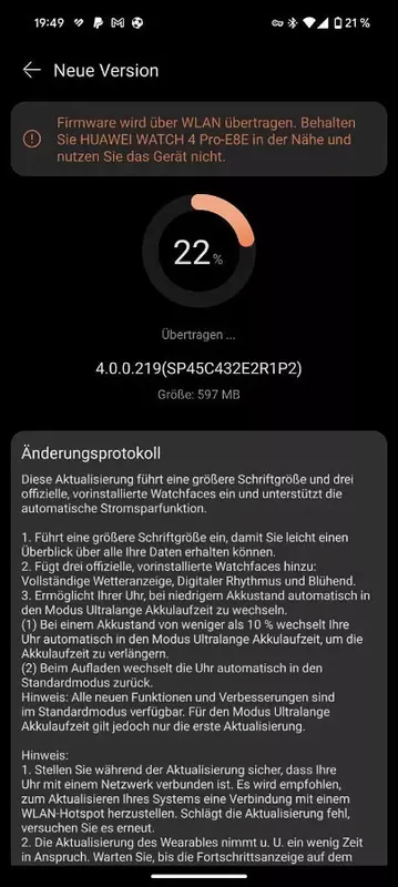 De update is uitgebracht met HarmonyOS buildnummer 4.0.0.219 en weegt 597 MB. De ontwikkelaars hebben nieuwe wijzerplaten aan het systeem toegevoegd: Volledig Weer, Digitaal Ritme en Bloeiend. Daarnaast heeft Huawei het lettertype van het horloge vergroot en een functie toegevoegd waarmee je de Ultra Long Battery Life-modus automatisch kunt inschakelen als het batterijniveau onder de 10% komt en uitschakelen als het horloge wordt opgeladen.