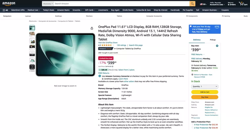 De OnePlus Pad is nu verkrijgbaar op Amazon voor minder dan $382.25 Hij is verkrijgbaar in één kleur en één geheugenvariant - 8/128GB.