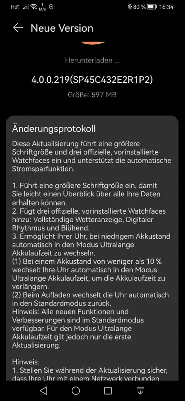 De firmware is uitgebracht met HarmonyOS versienummer 4.0.0.219 en weegt 597 MB. Volgens de officiële lijst met wijzigingen hebben de ontwikkelaars een groter lettertype aan het systeem toegevoegd, evenals nieuwe wijzerplaten: Volledig Weer, Digitaal Ritme en Bloei. Daarnaast heeft het horloge een automatische energiebesparingsmodus gekregen. Deze wordt ingeschakeld wanneer het horloge minder dan 10% lading heeft en wordt uitgeschakeld wanneer de gadget op de oplader wordt aangesloten.