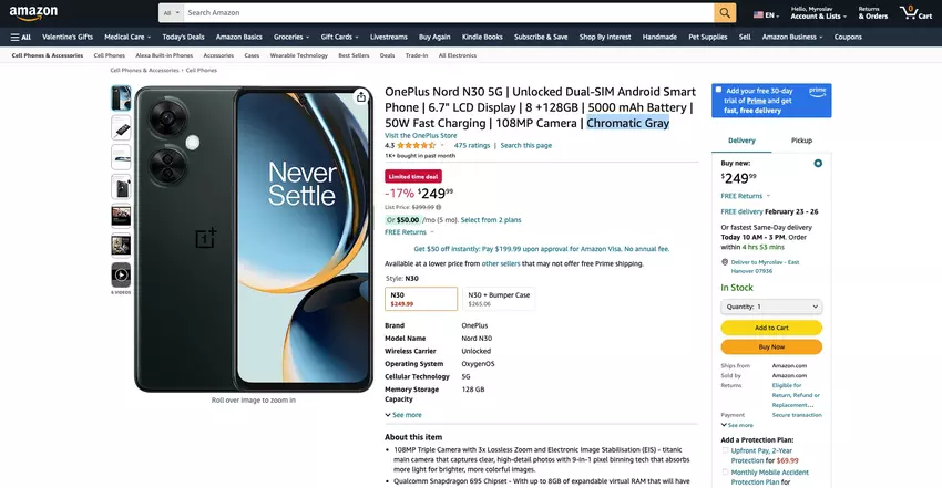 We hebben het over het OnePlus Nord N30 5G model. De gadget is op Amazon te koop voor $249.99 $299.99, -17%). Er is alleen de kleur Chromatic Gray en één geheugenwijziging - 8/128 GB.