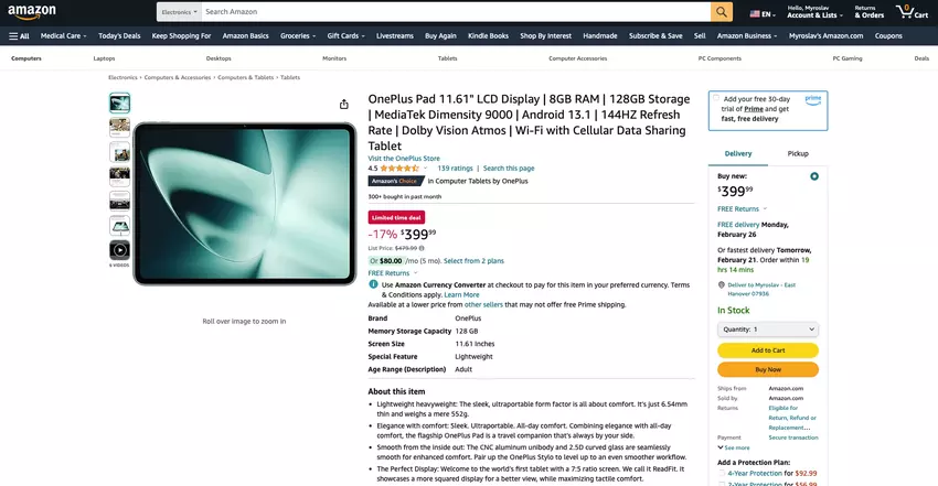De OnePlus Pad is nu verkrijgbaar op Amazon voor $382.25- $382.25. Er is slechts één kleur en één geheugenmodificatie beschikbaar - 8/128 GB.