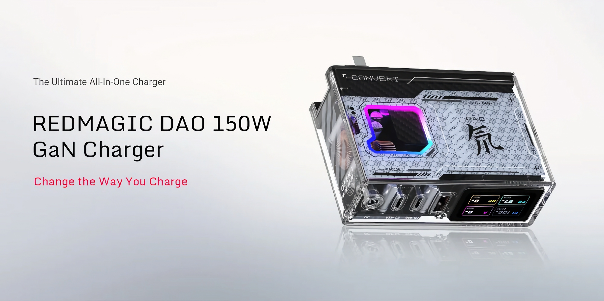 Red Magic DAO GaN: 150W transparante lader met vier poorten, LCD-scherm, RGB-verlichting en Bluetooth voor de prijs van een smartphone