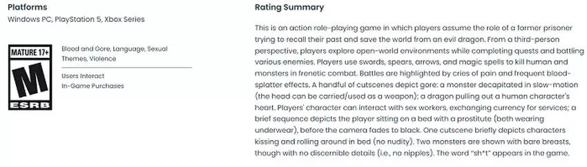 Na een gedetailleerd onderzoek van het spel hebben ESRB-experts verklaard dat Dragon's Dogma 2 wordt aanbevolen voor mensen ouder dan 17 jaar en hebben ze het spel een M ("Mature") rating gegeven.