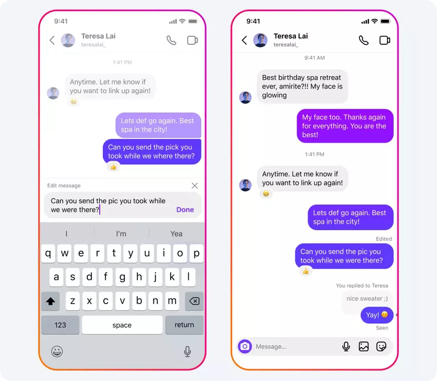 Voorheen, als een gebruiker zijn privébericht wilde veranderen, moest hij het verwijderen en opnieuw versturen. Nu hoef je alleen maar op het bericht te tikken en het ingedrukt te houden om het bewerkingsmenu te laten verschijnen. De correspondentie laat echter wel zien dat het bericht is bewerkt.