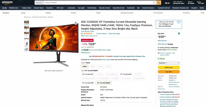 AOC CU34G3S op Amazon: 34-inch gebogen monitor met 165Hz verversingssnelheid en $40 korting