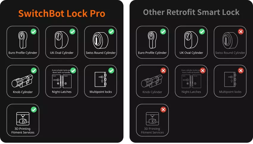 Naast vingerafdrukken kan SwitchBot Lock Pro worden ontgrendeld met gegenereerde eenmalige of tijdelijke geldige codes. Net als spraakassistenten Amazon Alexa, Google Assistant en Apple Siri. Het slot kan worden gebruikt in het Samsung SmartThings smart home ecosysteem en elk ander Matter-enabled smart home ecosysteem (vereist een apart Hub Mini Matter Enabled apparaat). Ontgrendeling is mogelijk via een smartphone-app, aangesloten NFC-kaarten en Apple Watch. Het slotontwerp maakt het ook mogelijk om de originele fysieke sleutel van het deurslot te gebruiken.