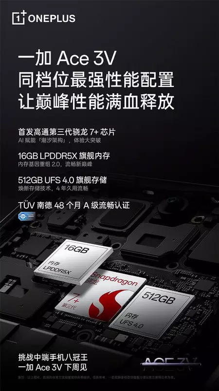 In een nieuwe poster heeft het merk de hoogste configuratie van het toestel bevestigd. OnePlus beweert dat de Ace 3V de krachtigste hardwareconfiguratie in zijn prijssegment zal hebben met een Snapdragon 7+ Gen 3 chipset, 16GB LPDDR5x RAM en 512GB UFS 4.0 opslag.