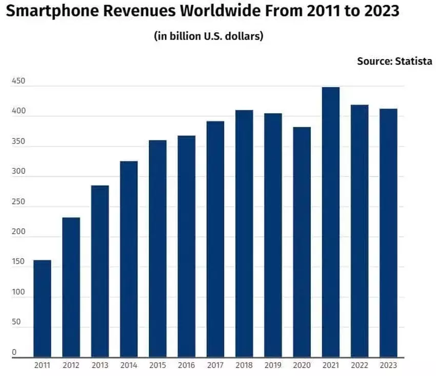 De wereldwijde verkoop van smartphones is de afgelopen 2 jaar met 36 miljard dollar gedaald