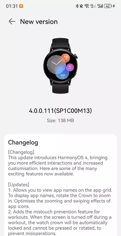 We hebben het over HarmonyOS 4. De update is uitgebracht met buildnummer 4.0.0.111 en weegt 138 MB. Het systeem is al in golven uitgerold naar horloges over de hele wereld. Je kunt controleren op OTA in de app op je smartphone.