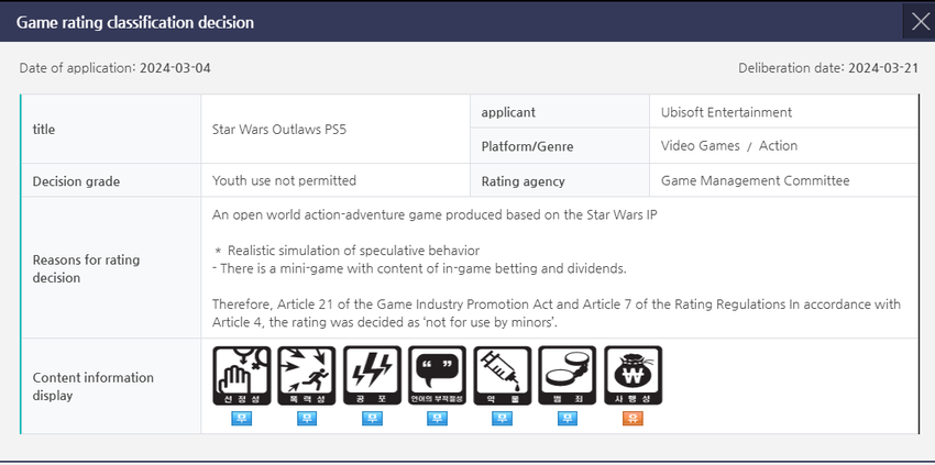 We schreven dat er een nieuwe trailer voor Star Wars Outlaws werd gepresenteerd op de Future Games Show. Daar houdt het nieuws over de game echter niet op, want Outlaws heeft een leeftijdsclassificatie gekregen in Korea.