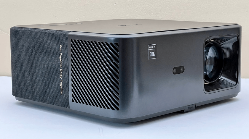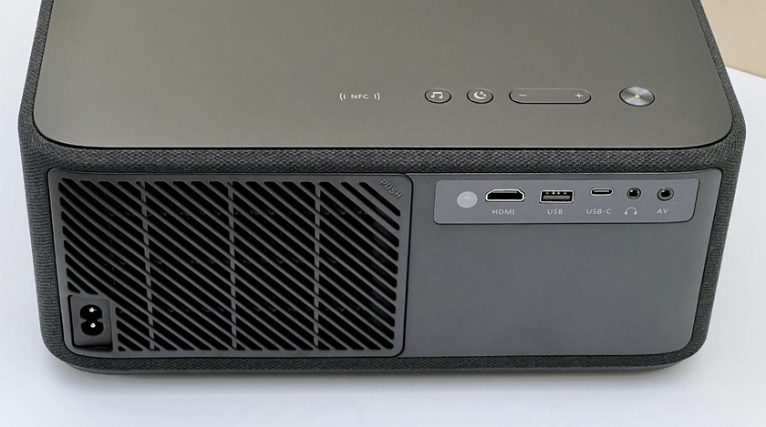 De Yaber K2s heeft een slanke witte behuizing met afgeronde hoeken en een donkergrijs frontrooster. De lens is off-center gemonteerd, met ventilatieopeningen aan beide zijden voor koeling. Het bedieningspaneel op de achterkant voelt prettig aan. Aan de achterkant vind je een reeks poorten, waaronder HDMI, USB en een hoofdtelefoonaansluiting. De algehele look is modern en minimalistisch.