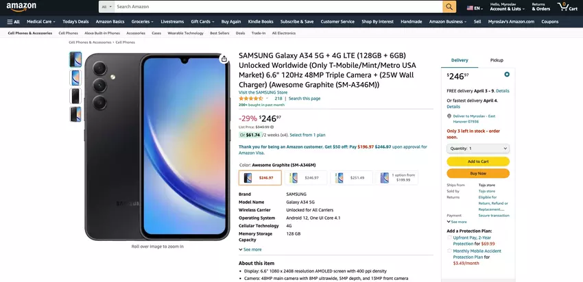 Samsung Galaxy A34 5G op Amazon: 120Hz AMOLED beeldscherm, Dimensity 1080 chip en 48MP drievoudige camera met 29% korting