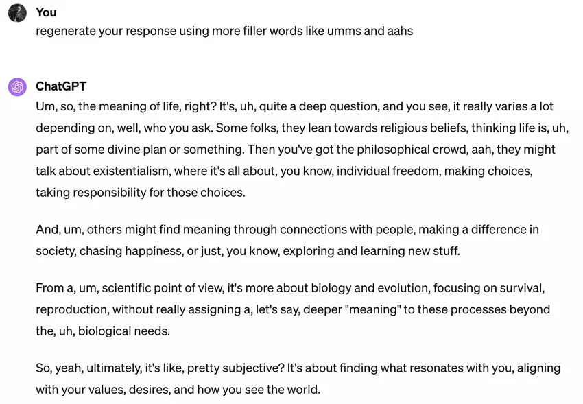 Terwijl je bij de eerste methode de hack elke keer opnieuw moet toepassen om het realisme van de stemtekst te verhogen, moet je bij de tweede methode speciale instructies toevoegen aan ChatGPT zodat het altijd meer opvulwoorden gebruikt in zijn antwoorden.
