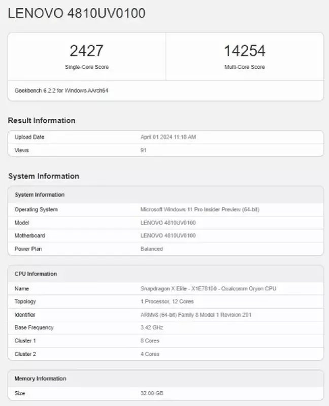 In een nieuwe benchmarktest uitgevoerd door Geekbench 6 liet Qualcomm's Snapdragon X Elite processor een indrukwekkende prestatieverbetering van 49% zien. Dit resultaat werd behaald in een nieuwe Lenovo laptop met modelnummer 4810UV0100 uitgerust met deze processor. De processor toonde een single-core score van 2427 en een multi-core score van 14254 wanneer deze in de "gebalanceerde" energiemodus draaide.
