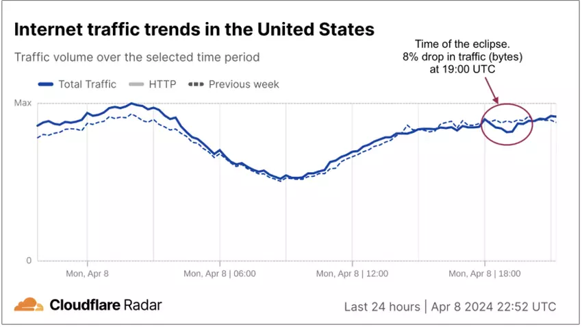 Op 8 april, tijdens de totale zonsverduistering in de Verenigde Staten en Canada, kelderde de internetactiviteit toen mensen naar buiten gingen om het natuurverschijnsel te bekijken. Volgens Cloudflare, een provider van internetinfrastructuur, nam het internetverkeer in deze regio's tijdens de eclips enkele minuten af. Vooral Vermont werd getroffen door de daling.