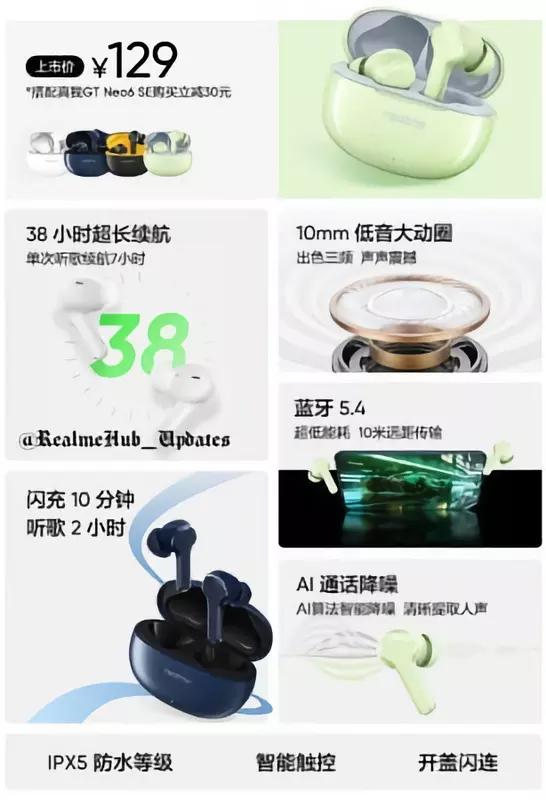 realme Buds T110: 10 mm drivers, Bluetooth 5.4, IPX5-bescherming en tot 38 uur batterijduur voor $18