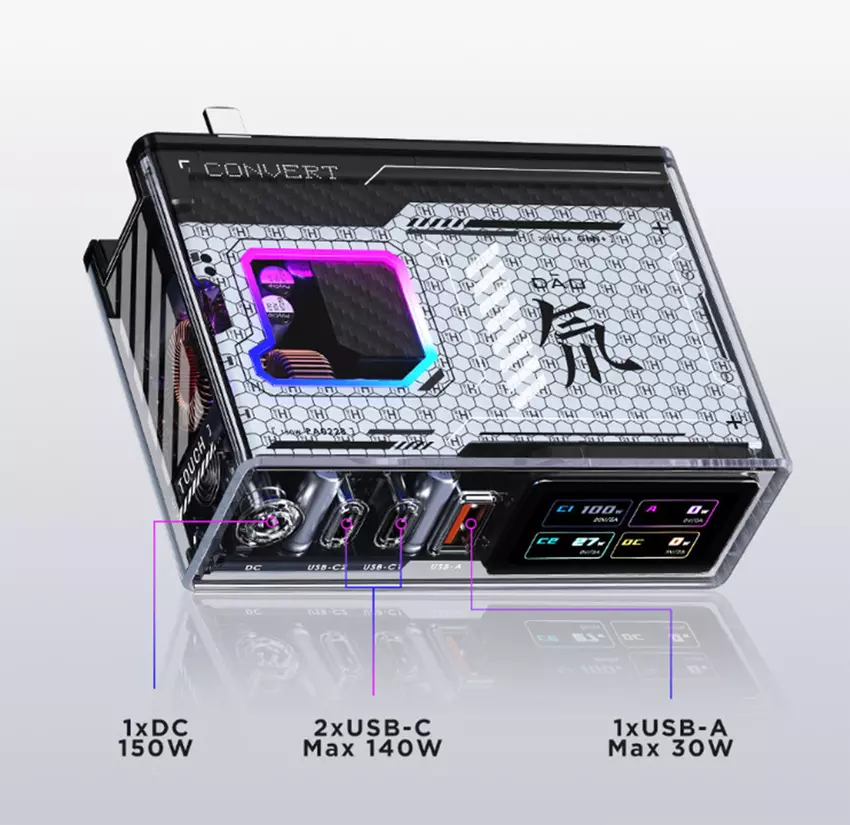 De lader heeft een maximaal vermogen van 150 W, maakt gebruik van het PD 3.1-protocol en heeft vier poorten: één DC, één USB-A en twee Type-C. De configuratie voldoet aan de oplaadbehoeften van een breed scala aan apparaten.