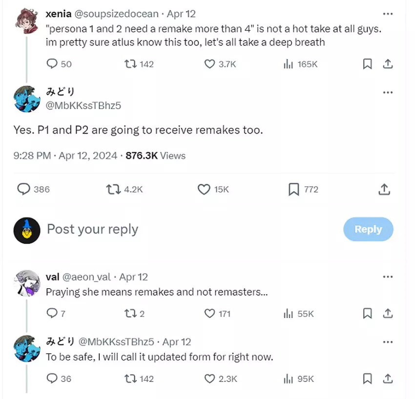 Tijdens een gesprek met abonnees van X onthulde Midori dat er remakes van het eerste en tweede deel van Persona in ontwikkeling zijn. Later verduidelijkte hij echter dat hij op dit moment geen nauwkeurige informatie heeft over de omvang van de updates van de games, dus voor nu denkt Midori dat het juist is om te praten over Persona 1 en Persona 2 re-releases voor moderne platforms, maar of het remakes of remasters worden, weet hij nog niet zeker.