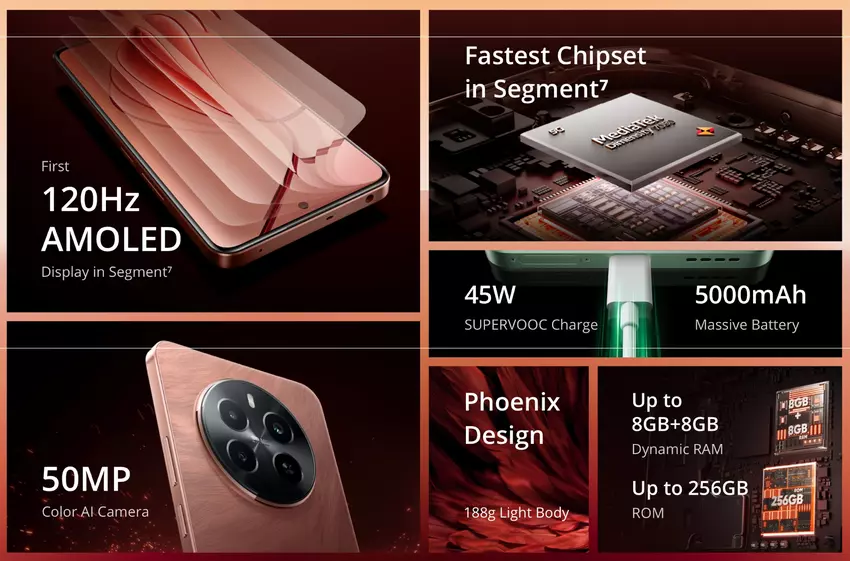 De eerste nieuwigheid in het assortiment was de Realme P1 5G. De gadget kreeg een 6,67-inch OLED-scherm met FHD+ resolutie, een verversingssnelheid van 120 Hz en een piekhelderheid van 1200 nits. De nieuwigheid draait op een MediaTek Dimensity 7050-processor gekoppeld aan 6/8GB LPDDR4x RAM en 128/256GB UFS 3.1 opslag.