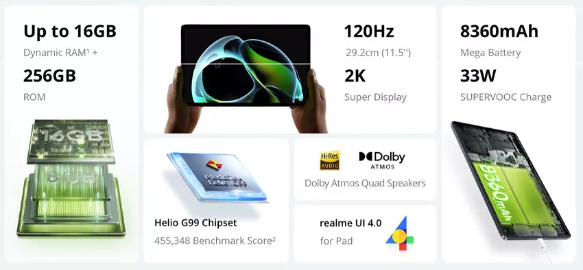 De specificaties van het apparaat zijn niet veranderd. De Realme Pad 2 (Wi-Fi) kreeg een 11,5-inch LCD-scherm met een resolutie van 2000×1200p en een verversingssnelheid van 120 Hz. Daarnaast werd de gadget uitgerust met MediaTek Helio G99-chip, 8 MP hoofdcamera, frontcamera met dezelfde resolutie, USB Type-C-poort en 8360 mAh batterij met 33W opladen.