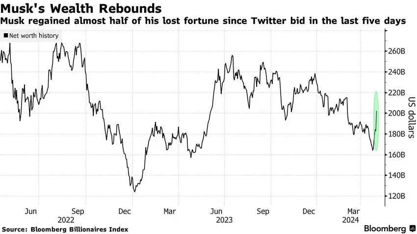Elon Musk, een bekende ondernemer en eigenaar van Tesla en SpaceX, heeft de afgelopen vijf dagen $37,3 miljard verdiend. Dit is zijn grootste wekelijkse stijging sinds maart 2022, wat aanzienlijk hoger is dan voor zijn aankoop van Twitter.