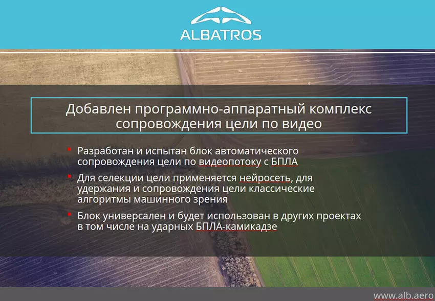 Een deel van de presentatie zal zich richten op de implementatie van machine vision-functionaliteit met behulp van het neurale netwerk, dat het proces van het zoeken, selecteren en volgen van gedetecteerde doelen automatiseerde. Het in samenwerking met Kaspersky Lab ontwikkelde machine vision systeem werd geïntegreerd in de Albatross M5 verkenningsdrone.