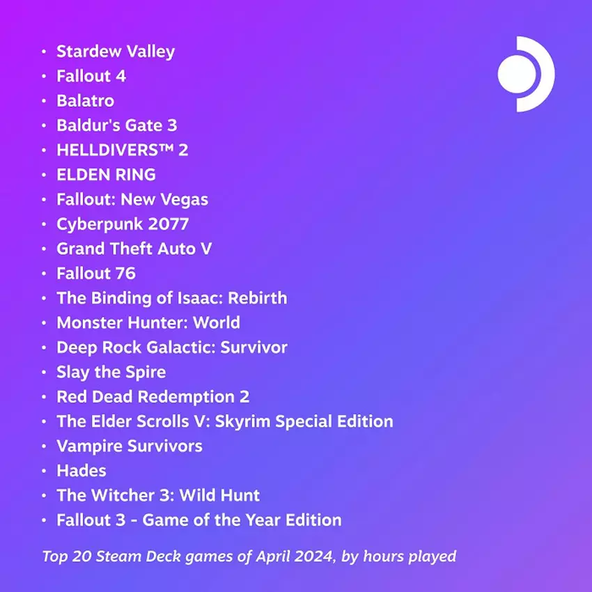 Valve heeft een maandelijkse lijst gepubliceerd van de populairste games onder gebruikers van Steam Deck handheld consoles.