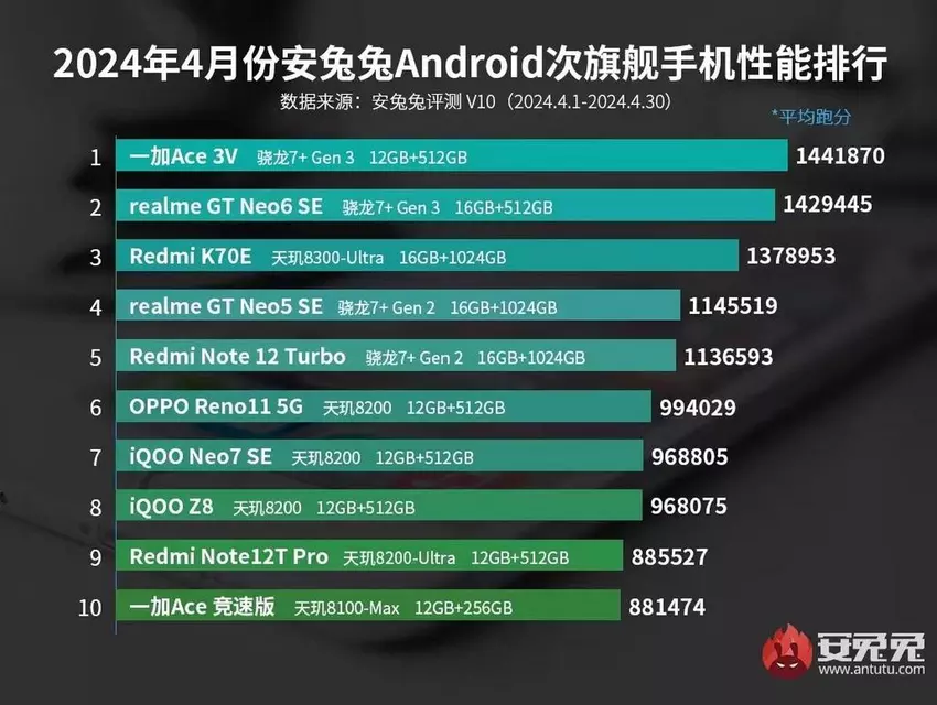 De OnePlus Ace 3V aangedreven door Snapdragon 7+ Gen 3 staat op de eerste plaats met een score van 1.441.870 punten. Vlak daarachter staat de Realme GT Neo 6 SE met dezelfde processor en een score van 1.429.445 punten. De derde plaats ging naar de Redmi K70e op Dimensity 8300-Ultra met een score van 1.378.953 punten.