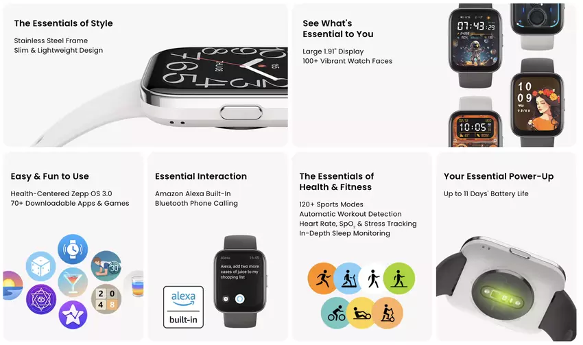 Amazfit Bip 5 Unity: 1,91" LCD-scherm, roestvrijstalen behuizing met IP68-classificatie en ondersteuning voor meer dan 120 modi voor $59