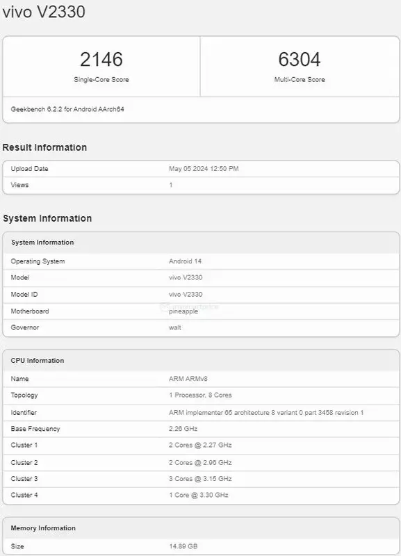 De smartphone met het modelnummer V2330 is opgedoken in de database van de Geekbench-prestatietest. Daarnaast is de gadget gecertificeerd door het Indonesische agentschap. Dat wil zeggen, de wereldwijde release van de nieuwigheid zou in de nabije toekomst moeten plaatsvinden.