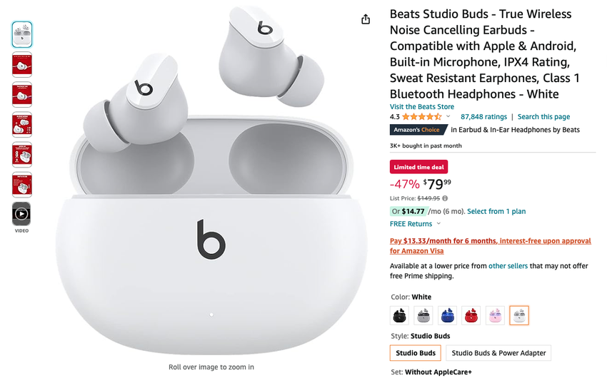 We hebben het over de Beats Studio Buds. Je kunt ze kopen voor minder dan $90 - $99.95 $149.95, -33%. Er zijn zes kleuren beschikbaar: Zwart, Maangrijs, Oceaanblauw, Rood, Zonsondergangroze en Wit.
