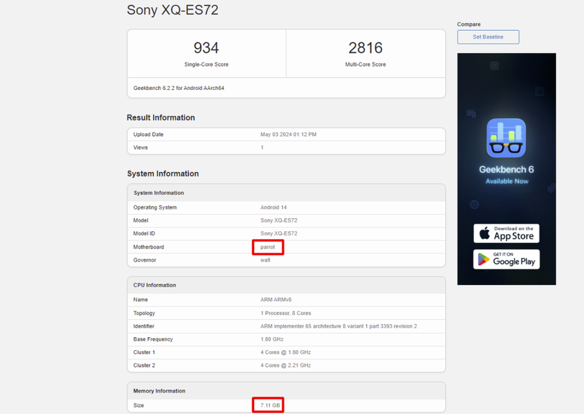 In afwachting van de onthulling van Sony's nieuwe line-up van 2024 smartphones, waaronder de Xperia 1 VI, Xperia 5 VI en Xperia 10 VI modellen, is de laatste gespot op Geekbench onder de codenaam "papegaai".