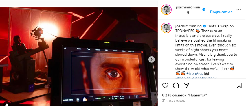 "TRON:ARES is klaar! Dankzij een ongelooflijke en onvermoeibare crew geloof ik echt dat we de grenzen van het filmmaken hebben verlegd met deze film. Zelfs zes weken lang nachtopnames hebben jullie nooit vertraagd. Ook wil ik onze geweldige cast bedanken voor het achterlaten van alles op het scherm. Ik kan niet wachten om de wereld te laten zien wat we hebben gedaan". - schreef Ronning.