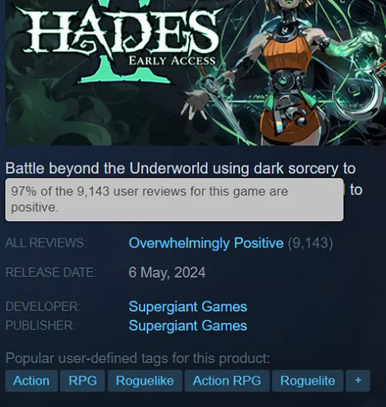 In slechts één dag tijd publiceerden spelers meer dan 9000 recensies op Steam en 97% daarvan is positief. Gebruikers merken op dat Hades II nu al (in early access) net zoveel inhoud heeft als het eerste deel, dat gedurende meerdere jaren is verbeterd en ontwikkeld.